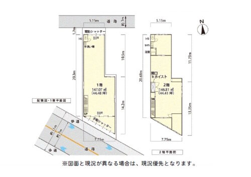 | 備考 | *現況使用中で引渡時期は相談 *契約期間2年 *2年以内の解約は短期解約違約金1ヶ月有り *貸主修繕負担は構造部と裏側電動シャッターのみ それ以外(エアコン、ホイスト、照明、トイレ、消防設備設置等)は借主様負担 *表入口前に普通車1台駐車可能 *表記面積は1階駐車場部分も含む *家賃保証会社加入要 初回100%、更新料10%/年 *建築確認申請無し、検査済証無し *二方道路 *準防火地域 *徒歩1分にミニストップ |