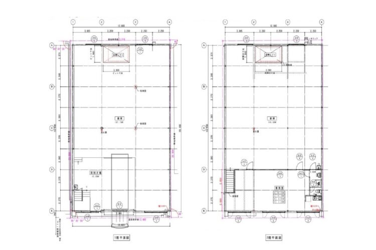 建物面積 | 1階:倉庫197.76㎡、荷捌き場45.89㎡ 計243.65㎡ 2階:倉庫186.90㎡、事務所54.03㎡ 計240.93㎡ 合計:484.58㎡(146.58坪) |