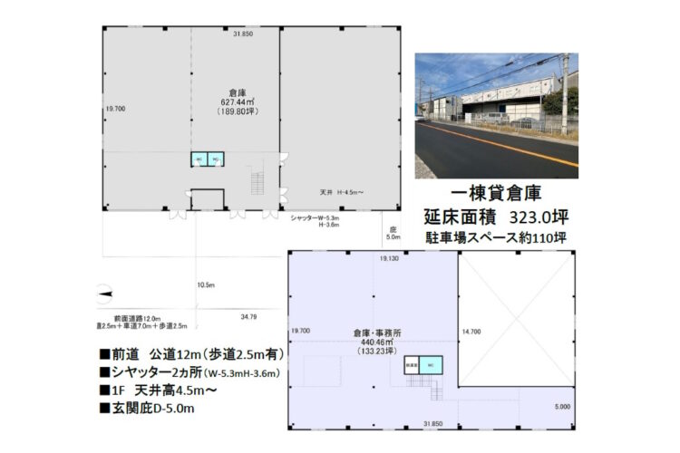 備考 | *現況空家 *2025年10月末より外壁工事予定で入居時期は11月末以降予定 *1階倉庫:627.44㎡(189.80坪) 2階倉庫/事務所:440.46㎡(133.23坪) *駐車スペース約110坪有り *1階天井高4.5m~ *契約期間3年 *家賃保証加入要 全保連 初回100%、10%/年 *連帯保証人必須 *火災保険加入要 *道路挟んで向かいはセブンイレブン *徒歩3分に業務スーパー・ウェルシア |