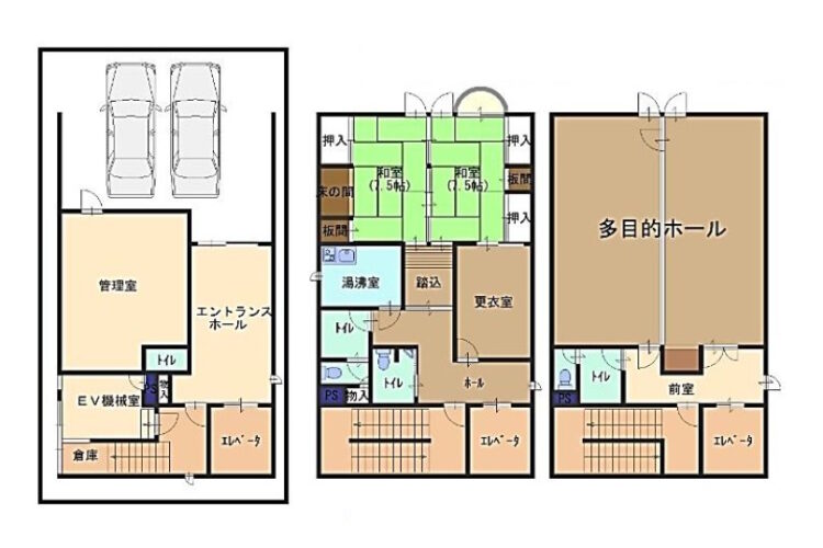 | 備考 | *現況空家 *エレベーター有り *駐車スペース2台可能 *地下1階は受水槽 *火災保険加入要 *賃貸保証会社加入要 保証人有りのプランのみ *1年以内の解約は賃料2ヶ月の違約金 2年以内の解約は賃料1ヶ月の違約金 *事務所、営業所、通販関連事業、店舗等に |