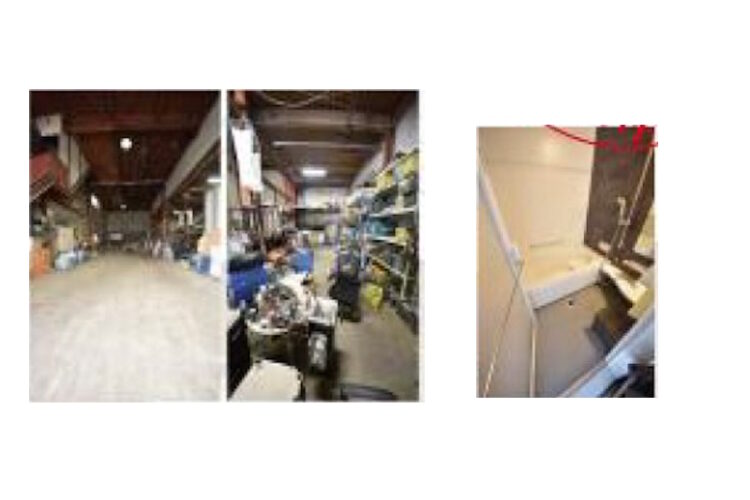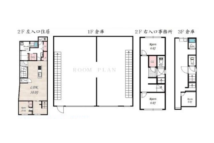 | 建物面積 | 左側建物 1階:100.59㎡(倉庫) 2階:91.10㎡(居宅) 右側建物 1階:169.83㎡(倉庫) 2階:190.78㎡(事務所) 3階:62.10㎡(倉庫) 合計:614.40㎡(185.85坪) |