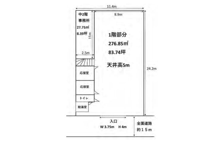| 備考 | *対象は2階建の1階部分 *クレーン2.8t有り *天井高5m *事務所有り *準防火地域 *賃貸保証会社加入必須 *徒歩4分にデイリーヤマザキ *徒歩5分にダイソー *徒歩9分にスーパーサンディ |