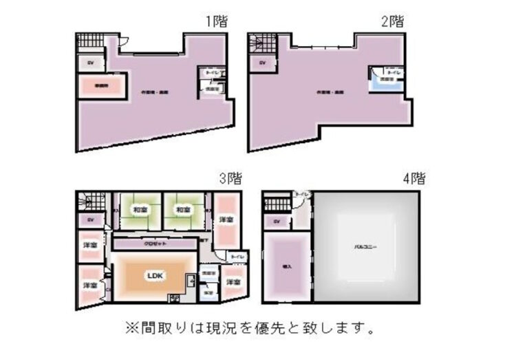 | 備考 | *現況空家 *建ぺい率80%、容積率300% *1、2階:倉庫、作業場 3階:住居 4階:倉庫、バルコニー *ホームエレベーター完備 *令和4年3階一部改装済み *引渡しは契約後3~6ヶ月で相談 |