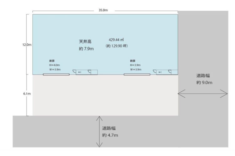 | 備考 | *現況使用中で引渡しは2026年4月1日以降 *契約期間2年 *二方道路の角地 *現状有姿 *天井高:約7.9m *駐車スペース有り(前面空地) *賃貸保証会社加入要 *借家人賠償付火災保険加入要 *ライフ門真 約700m |