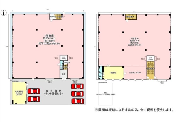 | 建物面積 | 倉庫1階:656.1㎡(198.47坪) 倉庫2階:656.1㎡(198.47坪) 事務所:44.04㎡(13.32坪) 合計:1,356.24㎡(410.26坪) |