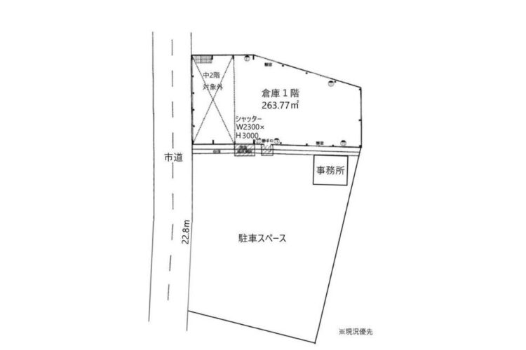 | 備考 | *現況賃貸中で引渡は令和8年8月上旬予定 *契約期間3年 *南面シャッター:H3.0m×W2.3.m *倉庫内天井高:3.1~5.0m *2021年11月倉庫外壁リフォーム *駐車スペース広い *大型車40ftコンテナ使用可 |