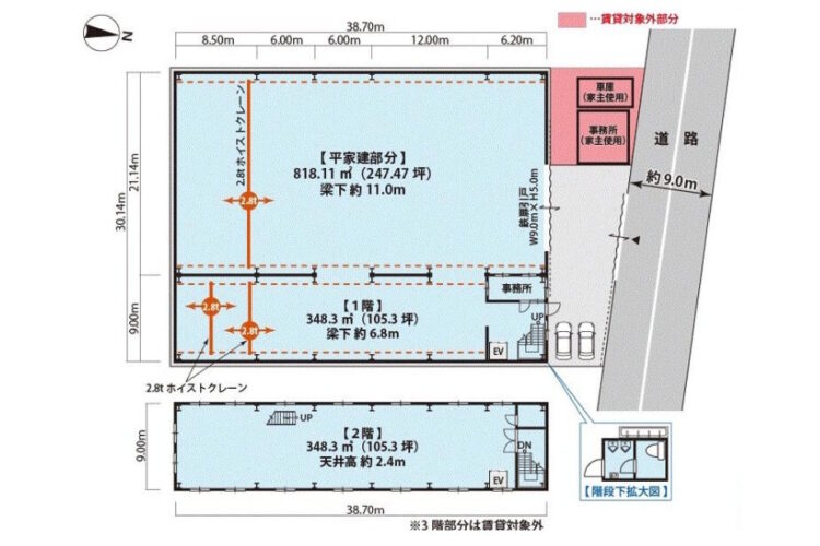 | 備考 | *駐車場有 *3階部分は賃貸除外 *ホイストクレーン2.8t:2基有 *キュービクル有 *荷物用簡易リフト:1基有 *契約期間 5年(長期賃貸希望) *近隣民家無 *大型車両可(要現地確認) *敷地内に物件家主使用事務所有 *平家建物部分梁下:約11m *3階建2階部分天井高:約2.4m *家賃保証契約加入要 *約60年前の建築物だが、部分的リフォーム済 *現況優先 |