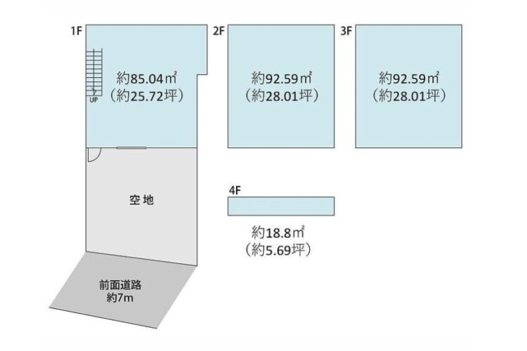 | 建物面積 | 1階:85.04㎡ 2階:92.59㎡ 3階:92.59㎡ 4階:18.80㎡ 合計:289.02㎡(87.42坪) |