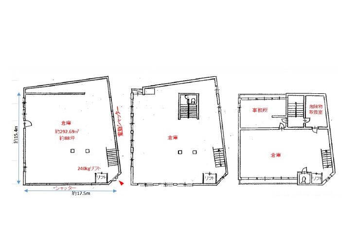 | 備考 | *現況空家 *貨物用EV有り *1階梁下:約5m *駐車スペース有り *フォークリフト荷役スペース確保可能 *東側電動シャッター有り *広い道路に面する角地 *準防火地域 *天保山マーケットプレイス約100m |