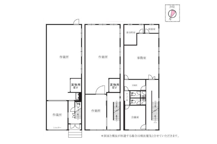 | 備考 | *現況空家 *1,2階工場倉庫 3階事務所 *エアコン:1階3基、2階3基、3階5基(残置物) *照明器具、シャッターは残置物 *貨物用エレベーター有り(残置物) *建物内車庫有り *旧工場、事務所として使用 *図面と現況が異なる場合現況優先 |