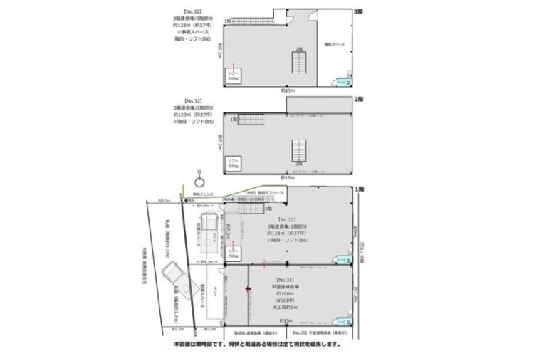 | 備考 | *現況空家 *契約期間2年 *リフト、クレーン有り *駐車スペース有り(2台可) トラック駐車荷卸し可能 テント庇付き *天井高5m *倉庫内造作可能 *前面私道で周辺住居があり、音、臭気、振動作業不可 24h使用不可 *賃貸保証会社加入要(保証料賃料1ヶ月/年) *火災保険加入要 *フリーレント1ヶ月相談可能 |