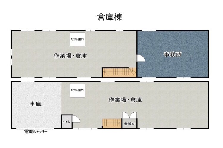 | 建物面積 | 倉庫1F:142.74㎡ 2F:142.74㎡ 計:285.48㎡(86.35坪) *その他付属建物有り |