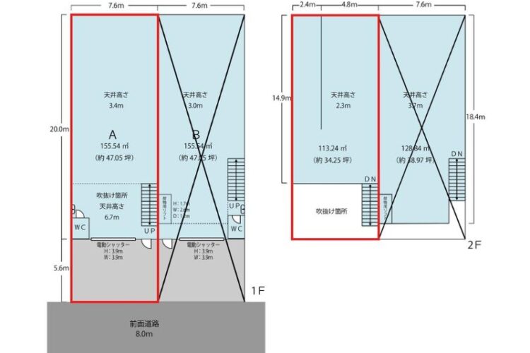 | 建物面積 | A棟 1階:約155.54㎡(47.05坪) 2階:約113.24㎡(34.25坪) 合計:約268.78㎡(81.30坪) |