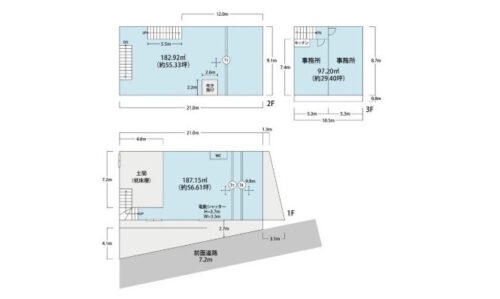 | 建物面積 | 1F:187.15㎡(約56.61坪) 2F:182.92㎡(約55.33坪) 3F:97.20㎡(約29.40坪) 延床面積:467.27㎡(約141.34坪) |