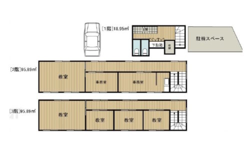 | 建物面積 | 1階:18.95㎡ 2階:95.89㎡ 3階:95.89㎡ 合計:210.73㎡(63.74坪) |