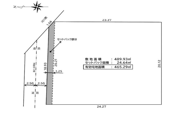 | 備考 | *現況更地 *建ぺい率60%、容積率200% *面積にセットバック24.64㎡含む 有効面積:465.29㎡(140.75坪) *北側公道18.93m接面 北側河川敷に1.66m接面 *掲載内容と現状に相違がある場合は現状優先 |